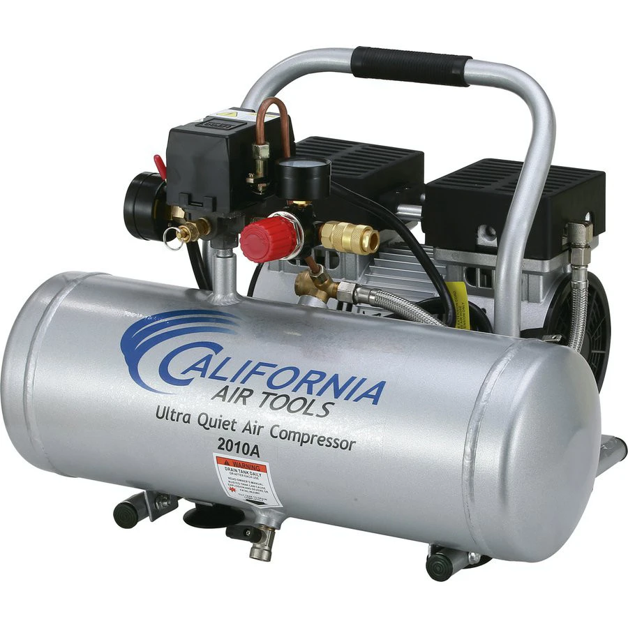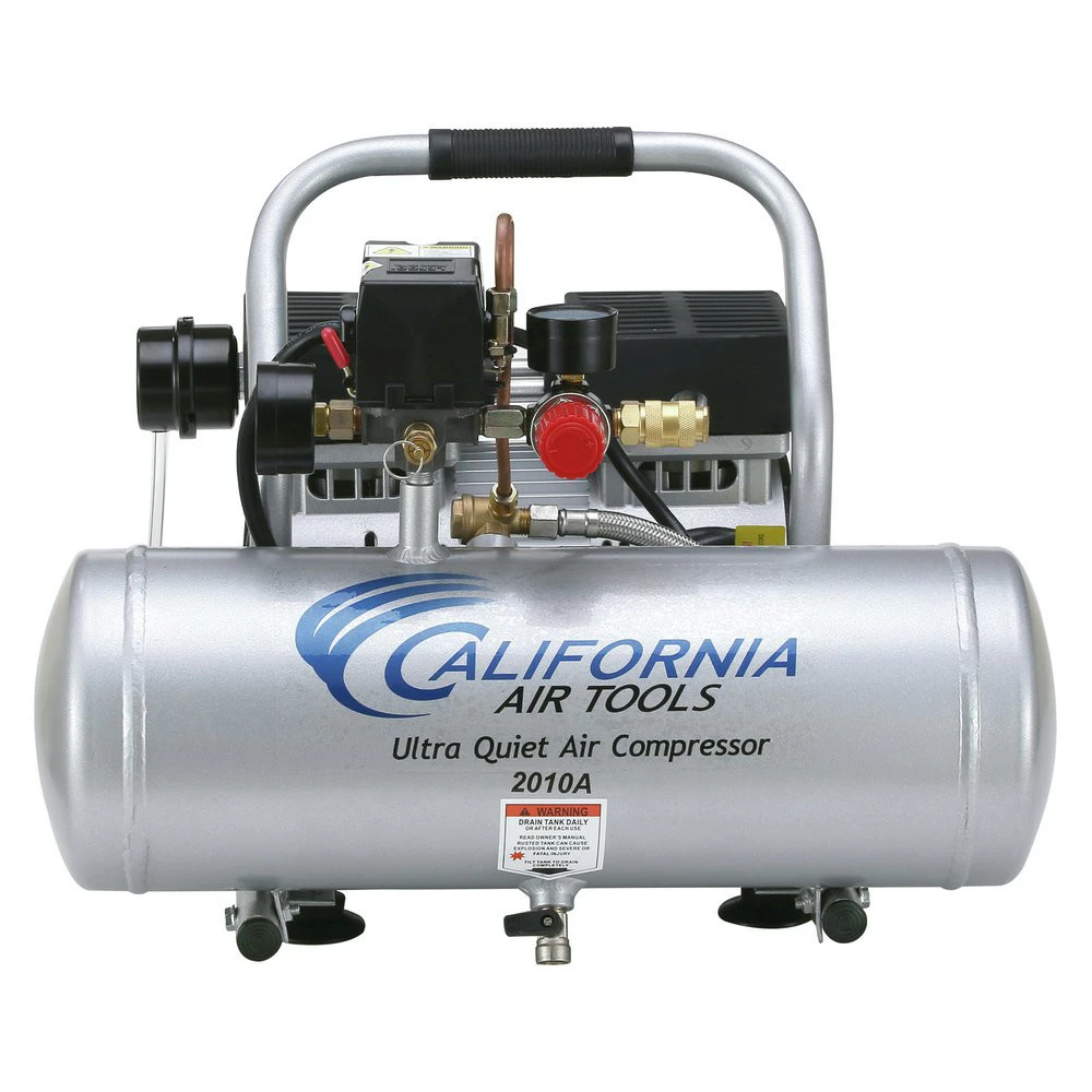 The California Air Tools 2010A 1 HP 2 Gallon Ultra Quiet Aluminum Tank Air Compressor is designed to be one of the quietest air compressors in the industry having only 60 decibels of sound. The powerful 1.0 HP motor operates at only 1,680 RPM creating less noise and less wear. The SP Series of Ultra Quiet Air Compressor Motors have been designed to increase duty cycle and allow for longer continuous run times. The CAT-2010A Air Compressor has an Oil-Free Dual Piston pump designed to have a life cycle before wear of 3,000 plus hours compared to other comparable air compressors with life cycles of 500 hours or less.