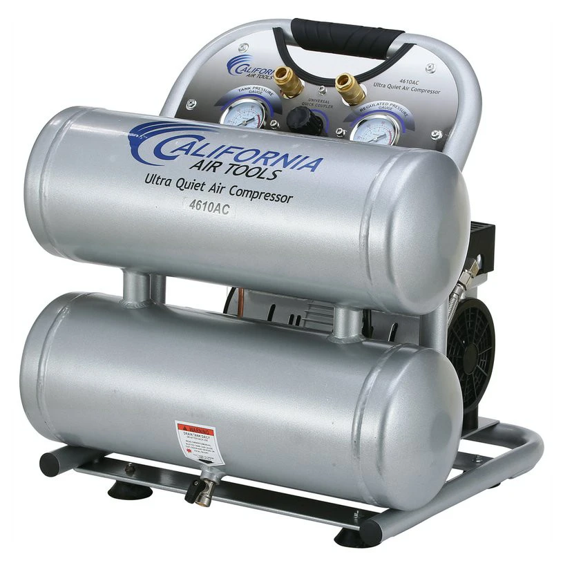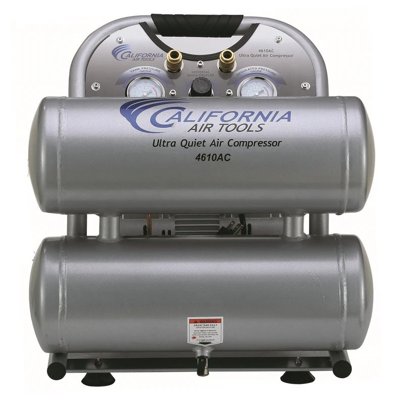 The California Air Tools 4610AC 1 HP 4.6 Gallon Ultra Quiet Aluminum Twin Tank Air Compressor is designed to be one of the quietest air compressors in the industry having only 60 decibels of sound. The powerful 1.0 HP motor operates at only 1,680 RPM creating less noise and less wear. The SP Series of Ultra Quiet air compressor motors have been designed to increase duty cycle and allow for longer continuous run times. The CAT-4610AC Air Compressor has an oil-free dual piston pump designed to have a life cycle before wear of 3,000 plus hours compared to other comparable air compressors with life cycles of 500 hours or less. The 4.6 Gallon Aluminum Air Tank is lightweight and very easy to transport. This air compressor is ideal for anyone working inside where noise is a major issue.