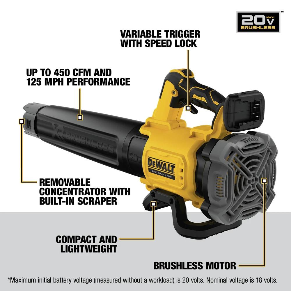 The 20V MAX Brushless Handheld Blower provides the ability to clear debris with an air volume of up to 450 cubic feet per minute and up to 125 miles per hour with the concentrator nozzle. With a lightweight and ergonomic design, the blower gives users directional control and tackles user fatigue. The variable speed trigger and speed lock give the user full power control.