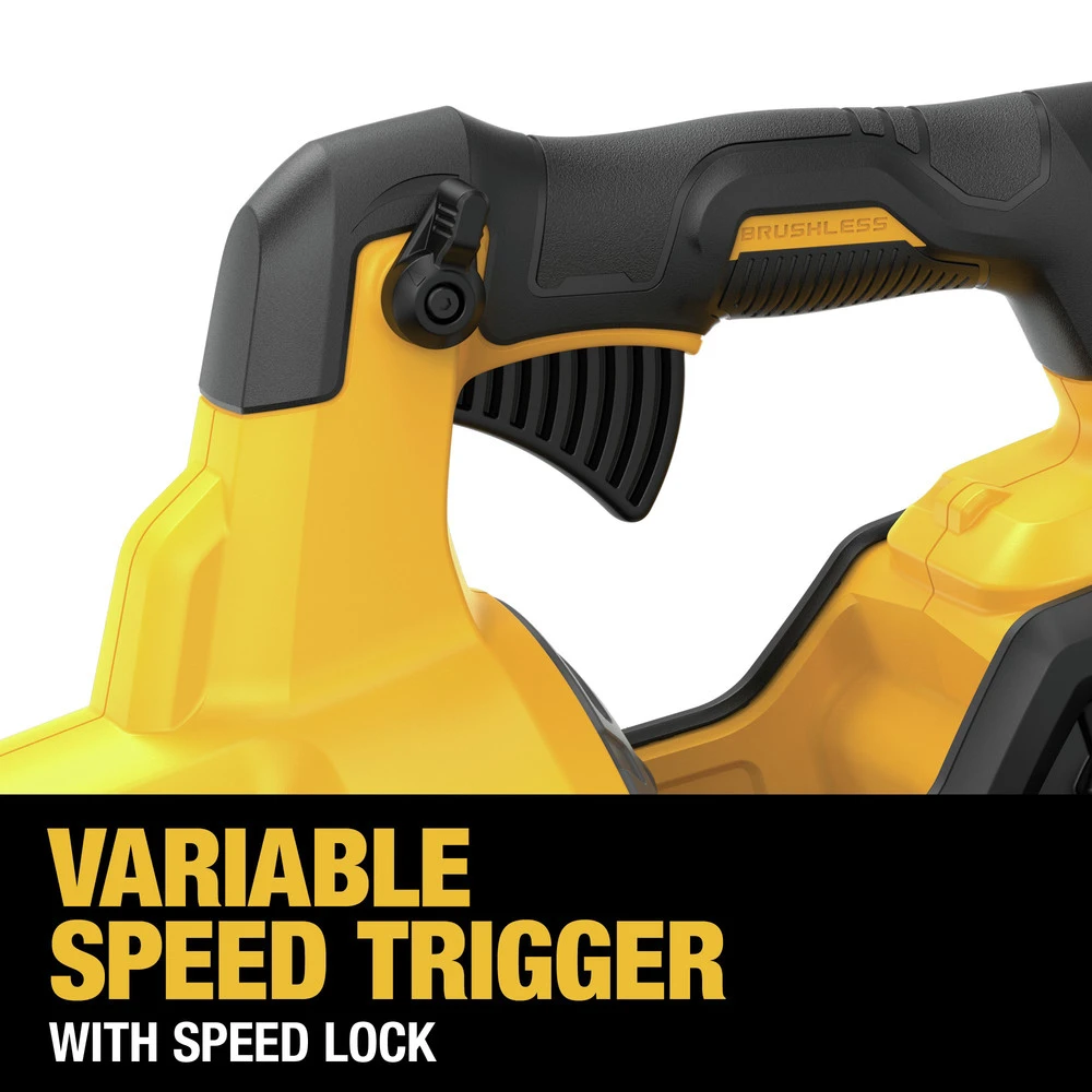 As part of the 60V MAX FLEXVOLT battery system of high-powered products, the 60V MAX FLEXVOLT Brushless Handheld Axial Blower powers through your task with up to 600 CFM of air volume and 125 MPH. It features a variable speed trigger and speed lock to control the blower output. The brushless motor design is high efficiency to provide high power and helps extend runtime. This kit also comes with a 20V/60V MAX FLEXVOLT battery that can both power your line-up of 60V MAX tools and equipment as well as your 20V MAX tools and can be charged with your 20V MAX chargers.