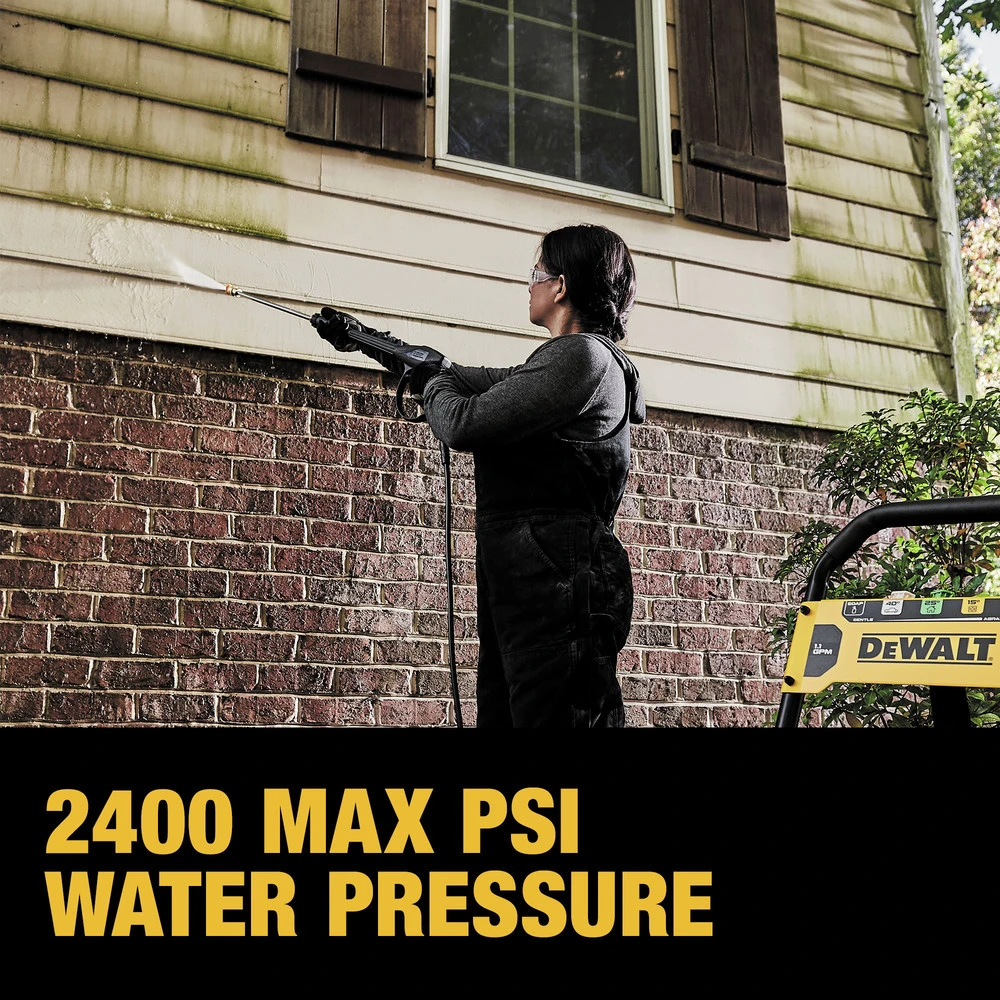 You can rely on the durable, mobile, and powerful DEWALT 2400 PSI Pressure Washer, delivering enough power to handle your outdoor cleaning tasks. Be prepared to tackle just about any job or wash your vehicle with the accessories you need. This Cold-Water Pressure Washer comes equipped with 5 nozzles, including a Turbo nozzle and built-in storage for organization. Built to transport over rugged terrain, the pressure washer features premium 10 in. pneumatic wheels so you can take it to the jobsite. The 2400 PSI Cold-Water Pressure Washer is backed by a 3 Year Limited Warranty.