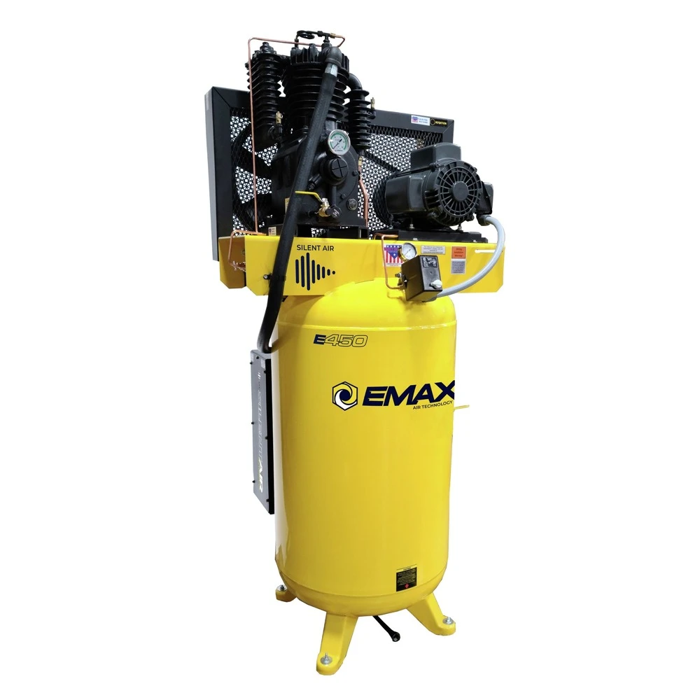This EMAX Industrial Plus 10 HP 2 Stage V4 3 Phase vertical 120 gal. Piston Air Compressor is designed for up to 70,000 hours of commercial or industrial use with proper maintenance. This unit delivers 38 CFM @ 100 PSI, top PSI of 175. Our unit features industrial electric motors, magnetic starters, automatic tank drain, powder coated ASME tank 200 PSI rating, along with our continuous run functionality all paired with all cast iron 70,000 hr. rated patented pressure lubricated reciprocating pump. This unit features our patented Patented Silent Air System silent air system already installed. The Patented Silent Air System dissipates compressor intake noise by channeling the intake air through a series of baffle plates. This low-profile system adds 4 levels of air filtration along with making the compressor quiet, lowering the decibels by more than 35 percent. All backed by the warranty in the industry!