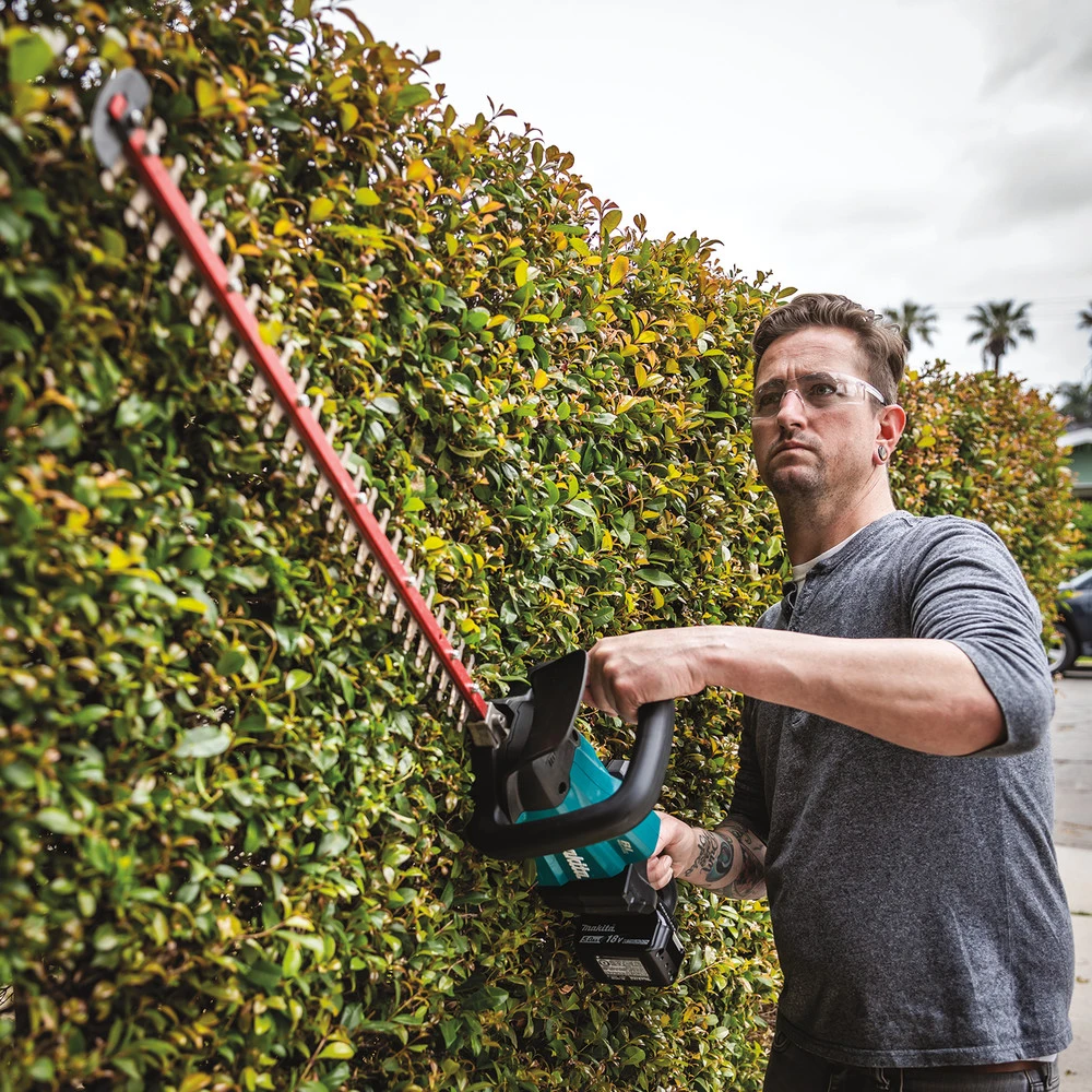 The Makita 18V LXT Brushless Cordless 24 in. Hedge Trimmer Kit (model XHU07T-R) is part of Makita’s wide range of cordless outdoor power equipment. The XHU07T-R Hedge Trimmer has a 24 in. Blade for increased cutting capacity and a 5 Position rotating handle for increased comfort when trimming vertically or at an angle. A Makita-built brushless motor delivers 4400 SPM for faster-cutting speed when set on the high speed option.