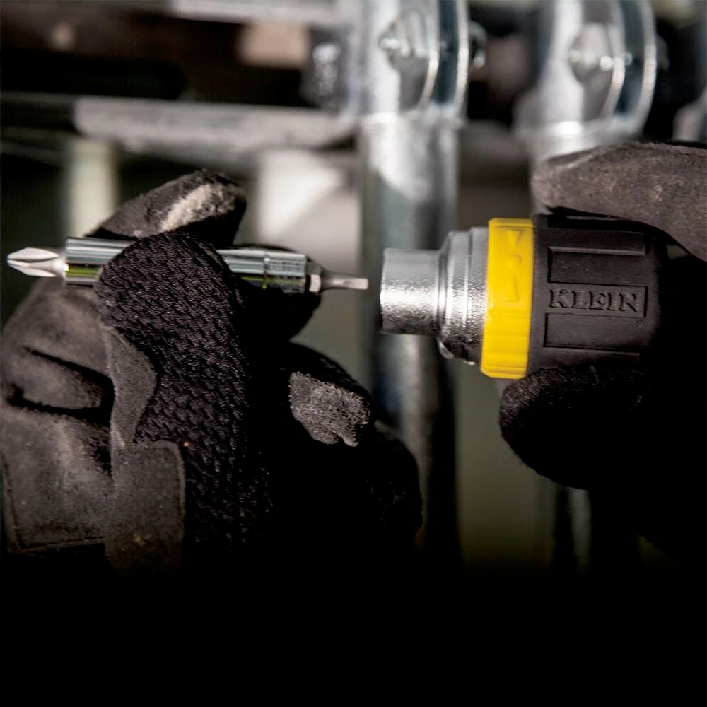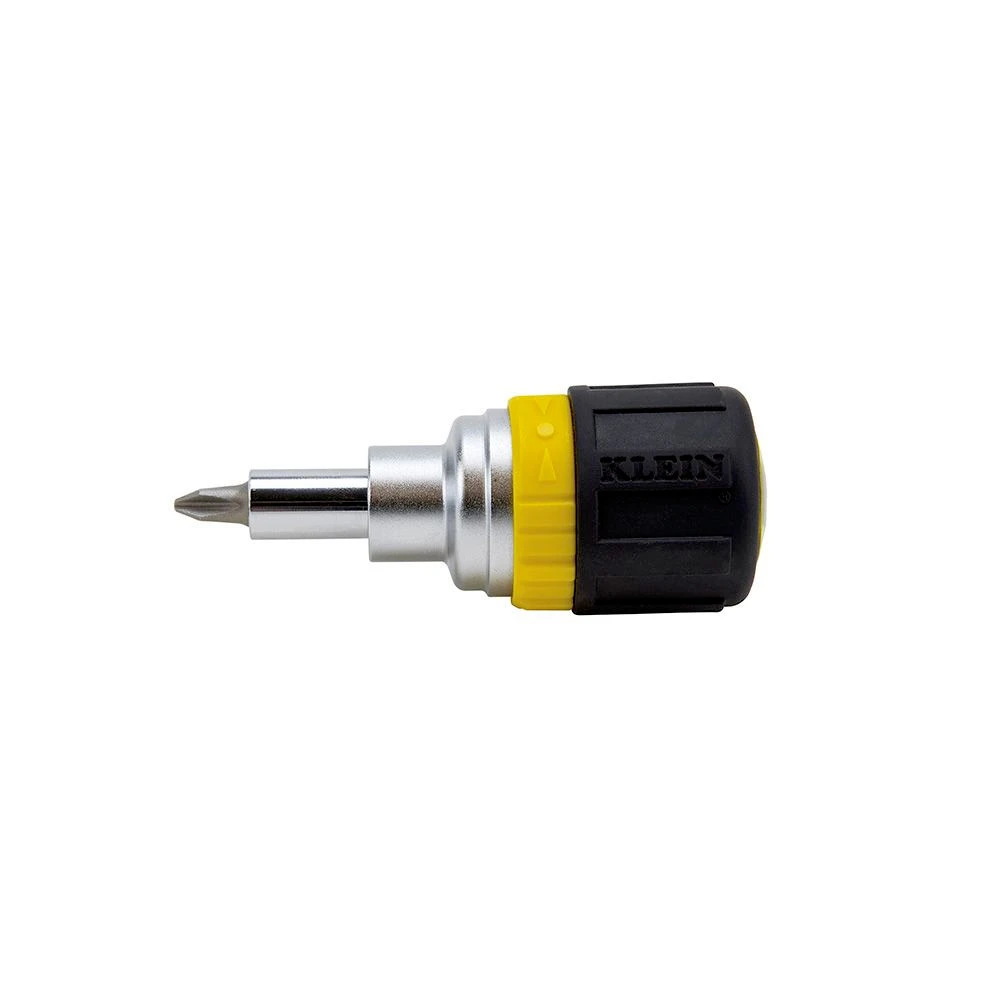 Klein Tools Multi-Bit Stubby Screwdriver / Nut driver with ratcheting mechanism lets you work faster and with more efficiency. Includes 1/4 in. and 5/16 in. nut drivers. With its Cushion-Grip handle, the stubby interchangeable screwdriver/nut driver was designed with comfort and efficiency in mind. The driver is made of the highest-quality tempered steel. Its strong, durable tips are manufactured to fit screw opening securely. They resist slippage and provide positive turning action. The strong nut driver function improves bit-holding power, even with tough applications.