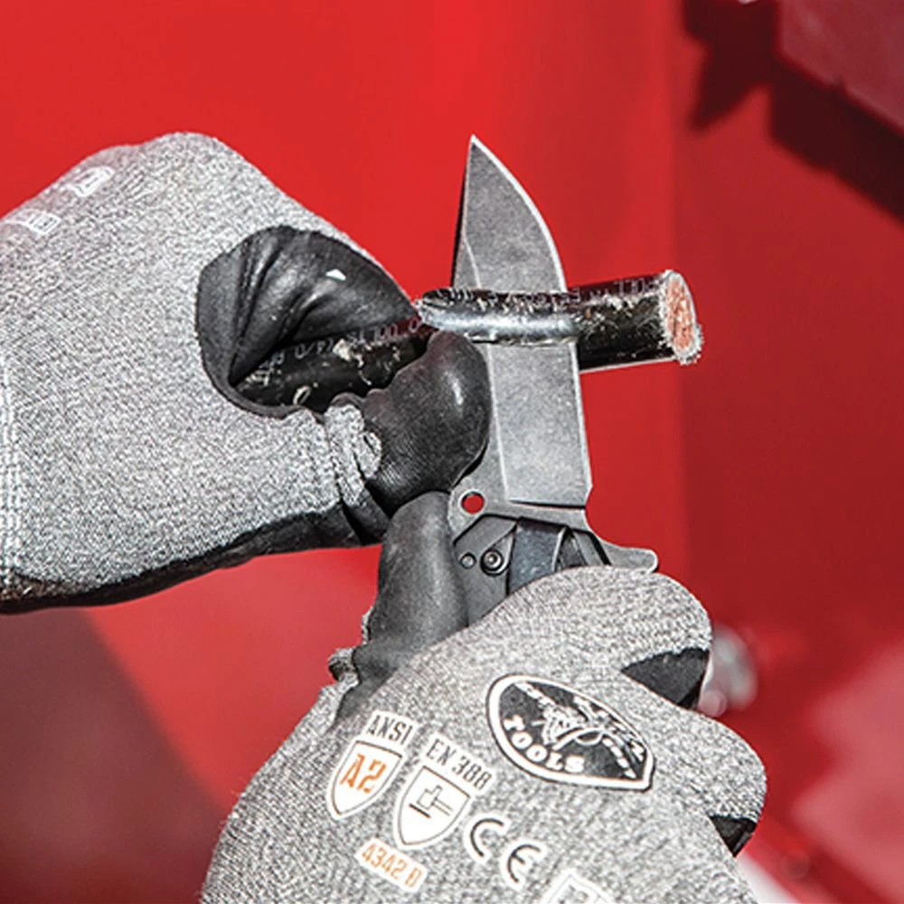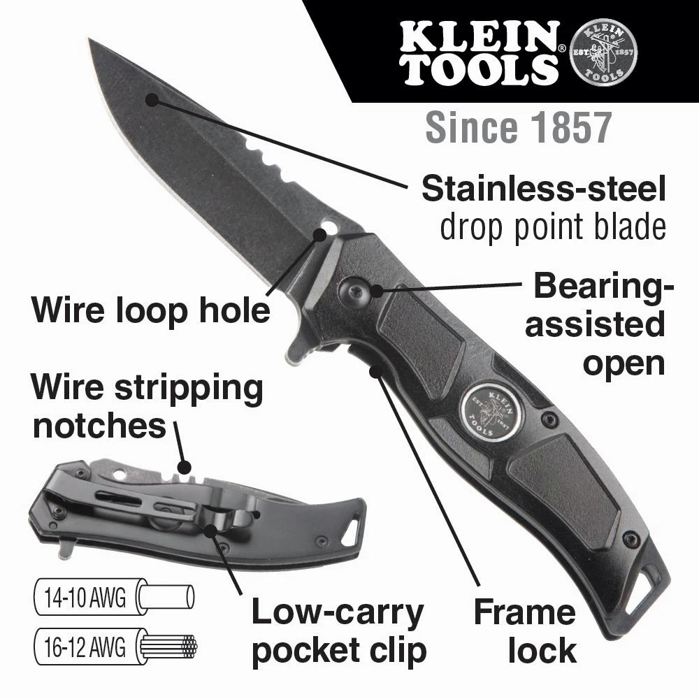Electrician’s pocket knife offers easy one-handed, bearing-assisted opening of the blade