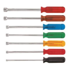 The Klein Tools Nut Driver Set with 6 in. shanks are manufactured from heat-treated, tempered steel for strength and feature comfortable Comfordome handles. The color-coded caps on the 7-piece set allow for quick identification of hex nut sizes and the grip is oil, gas and water resistant for added durability.