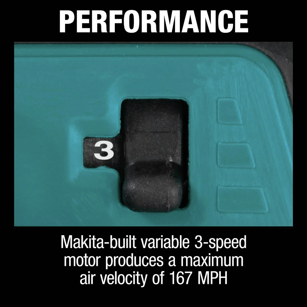 Makita-built variable 3-speed motor produces a maximum air velocity of 167 MPH