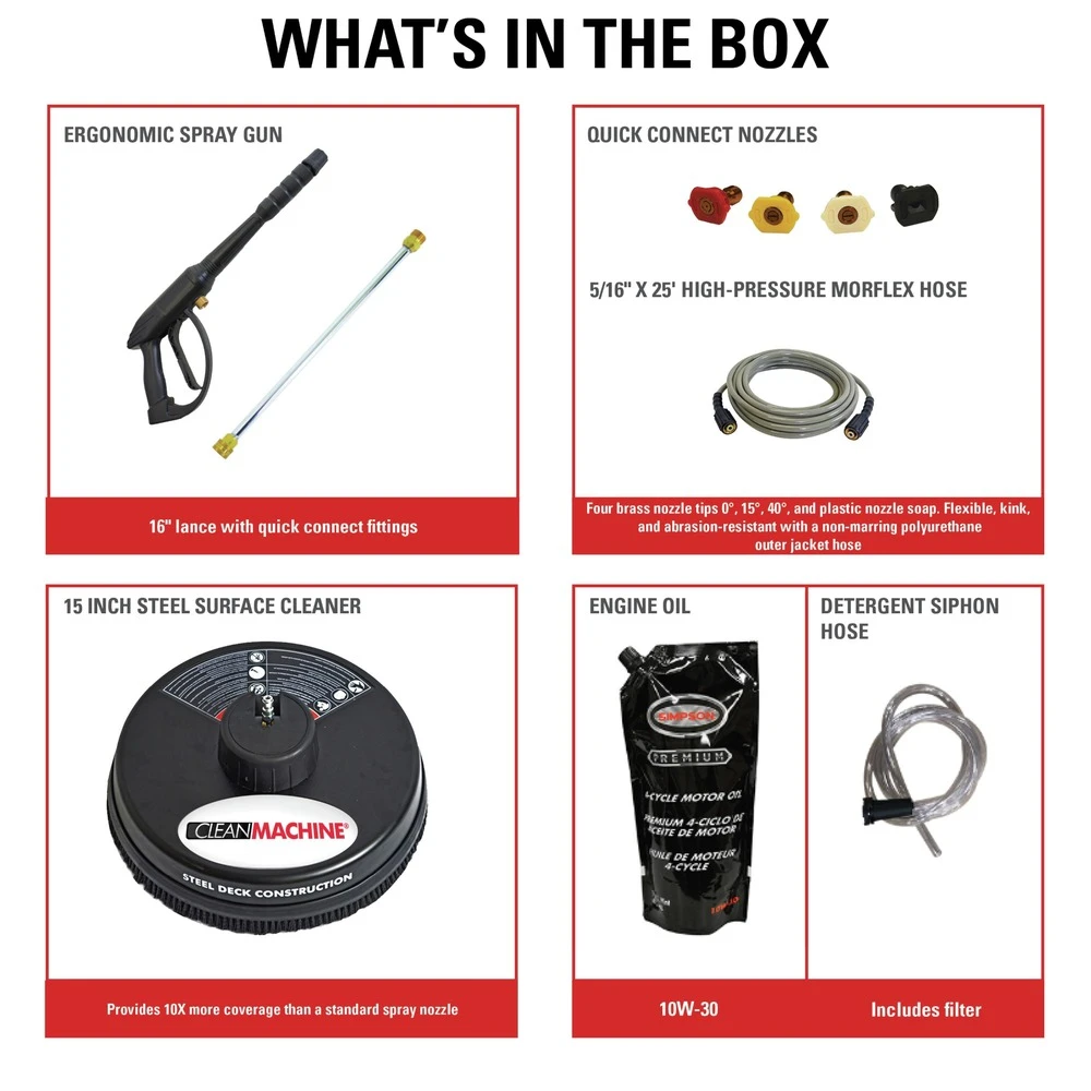 Clean big with the Clean Machine by SIMPSON! This gas pressure washer is lightweight, easy to store, and provides a powerful pressure washing experience. Just set up and you are ready to clean. The clean machine features a (50-state compliant) CRX engine paired OEM Technologies pump. This pressure washer steel frame is powder-coated for corrosion resistance. This compact gas pressure washer will allow easy access into hard-to-clean areas.