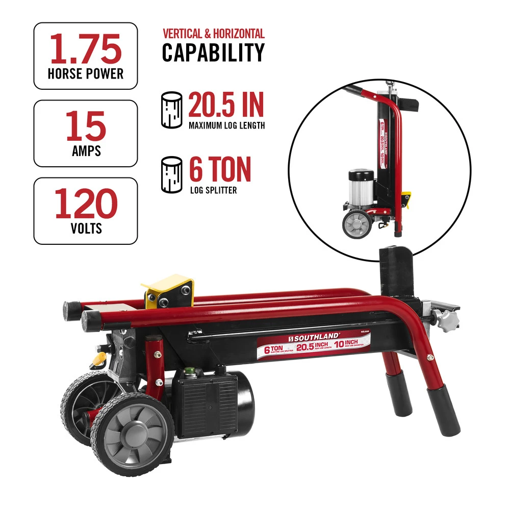Features a powerful 1.75 HP, 15 amp induction motor that effortlessly splits the most demanding types of wood. Safer and more productive than swinging a maul and axe. The integrated stroke limiter reduces cycle times for shorter logs. The heavy duty 5″ steel wedge splits logs quickly & easily. The vertical storage option allows for less space to be taken up in the garage or shop.