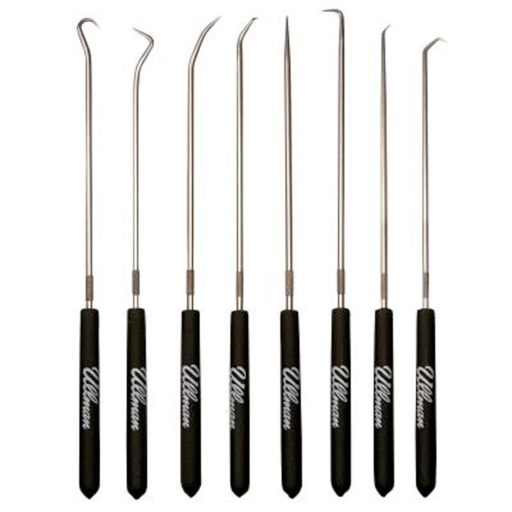 These precision hooks and picks are ideal for separating wires, removing fuses, O-rings, retrieving washers and other loose parts too small to pick up with your fingers. Ullman’s standard non-slip grip helps prevent slipping in wet or oily hands. All picks in this set are available individually. Threaded replacement picks are also available.